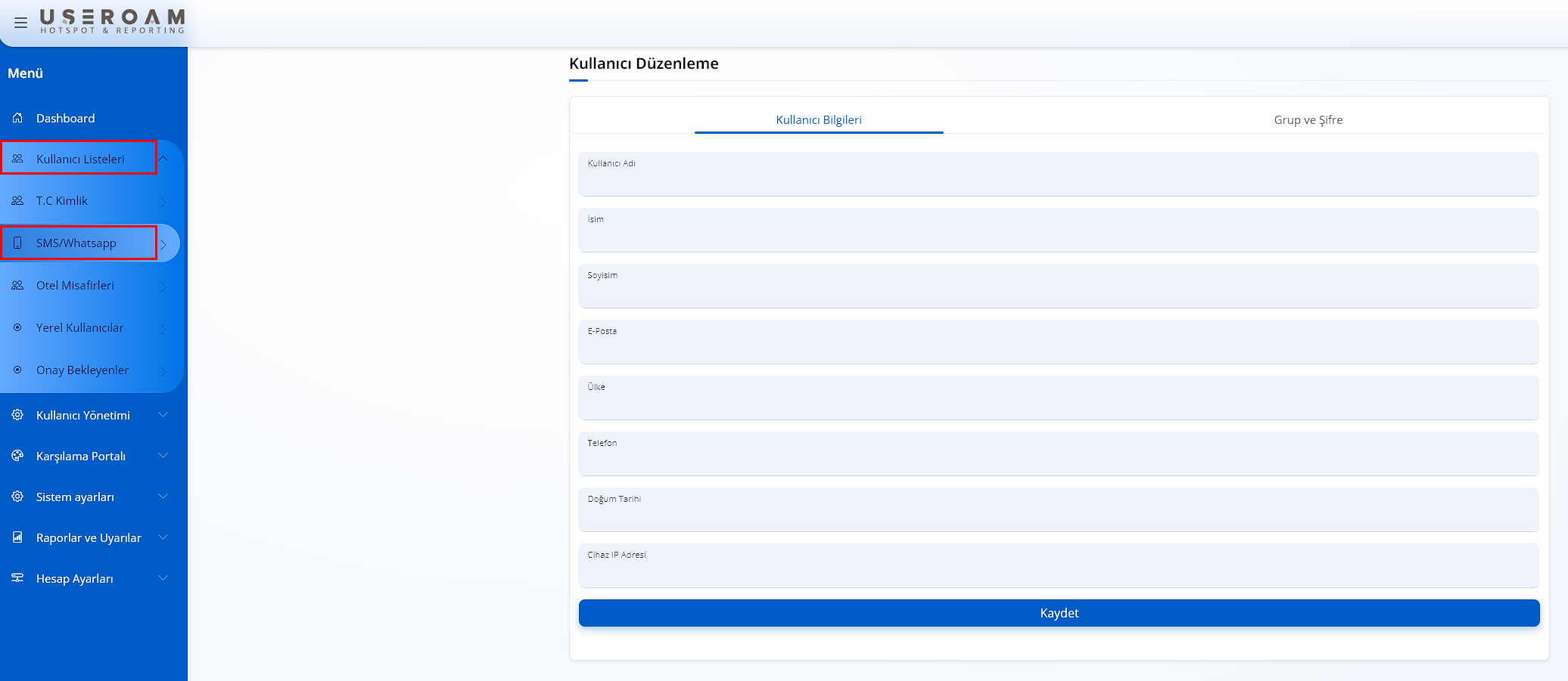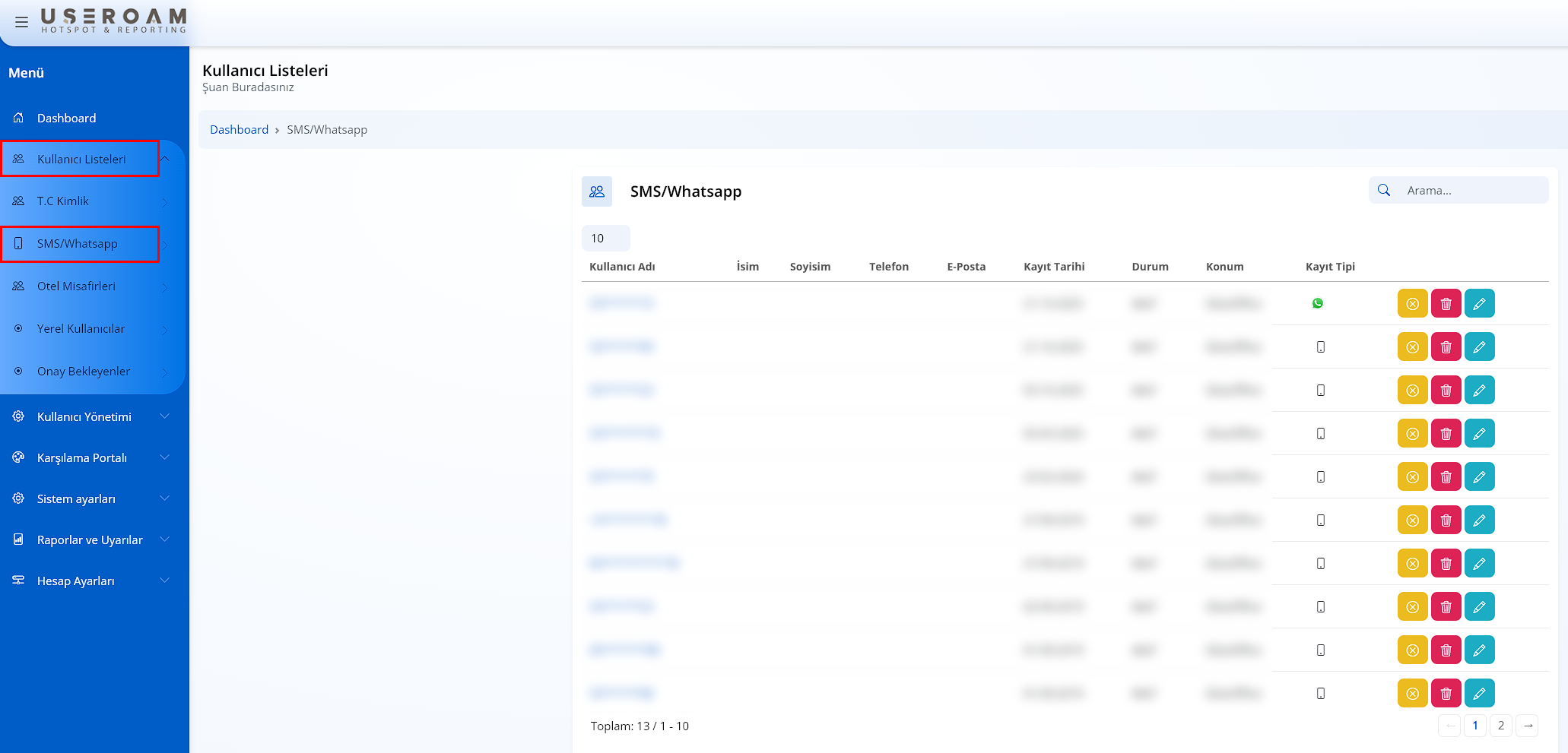 Bu kısımdan SMS ve Whatsapp ile kayıt olan kullanıcılarınızı görüntüleyip izin verilen bilgilerini değiştirebilir , kullanıcıyı silebilir veya engelleyebilir veya girişini onaylayabilirsiniz.