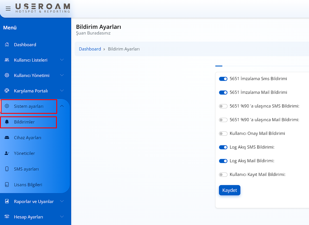 Log Akış Mail Bildirimi : Güvenlik duvarınızdan panel.useroam.com a doğru gönderilen syslog paketleri kesilirse mailinize bildirimi gider.