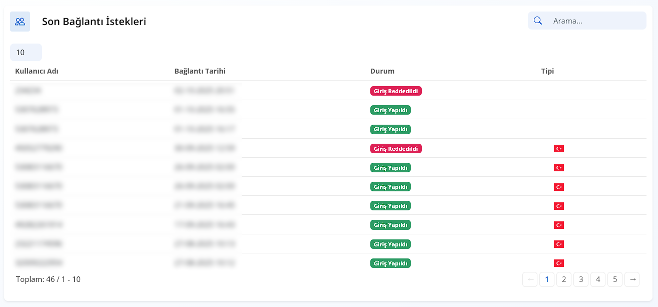 Son 5 Bağlantı : En son yapılan 5 giriş denemesinin durumunu ve altında bulunan Tüm bağlantılar ile tüm giriş isteklerinin durumunu görüntüleyebilirsiniz.